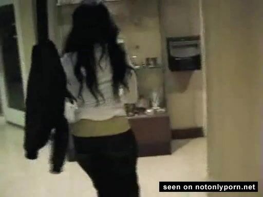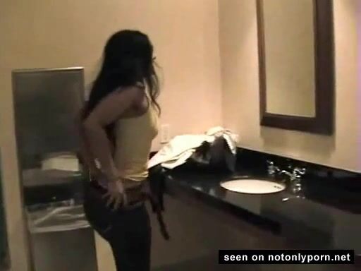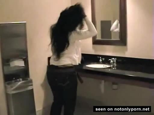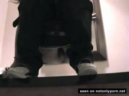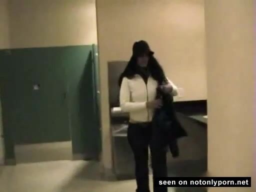 Very hot brunette girl pissing and farting in a public toilet