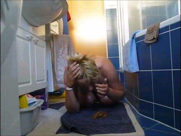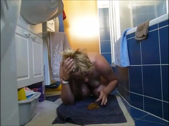 Blonde shitting on the floor and smearing on tits and face