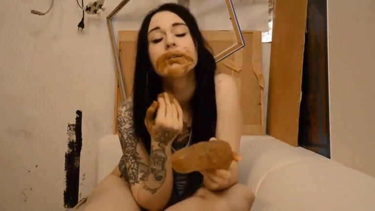 shit loving girl masturbates and tastes shitty dildo