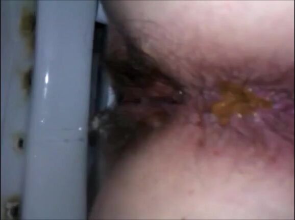 Hairy woman shitting closeup on a dirty toilet