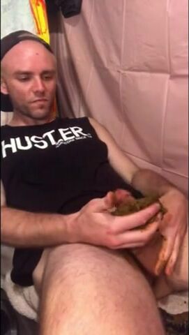 bound guy eating, swallowing, and shit jacking