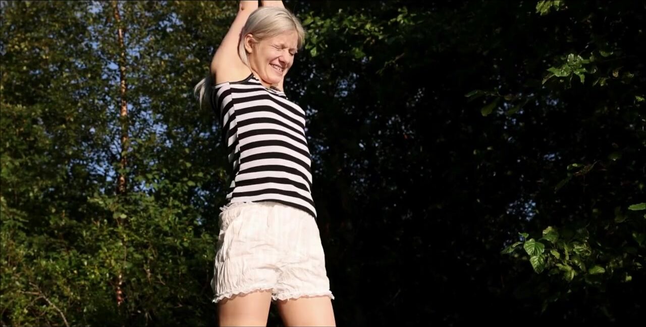 Blonde bends over and pees on the grass