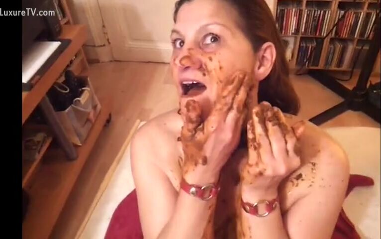 Dirty whore rubbing feces on her nude body