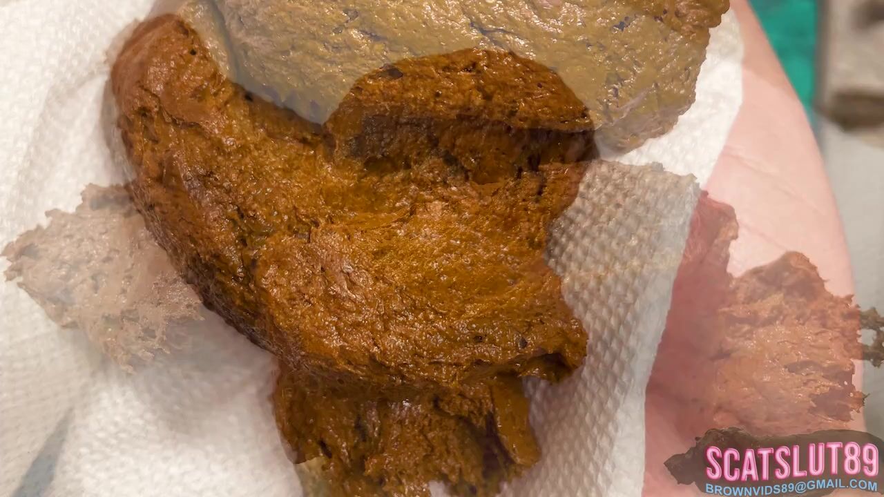 Woman on her side births huge turd.