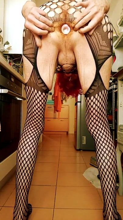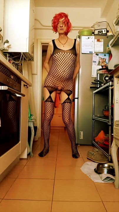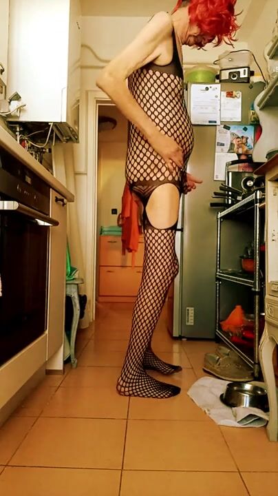 crossdressed with red wig and laces