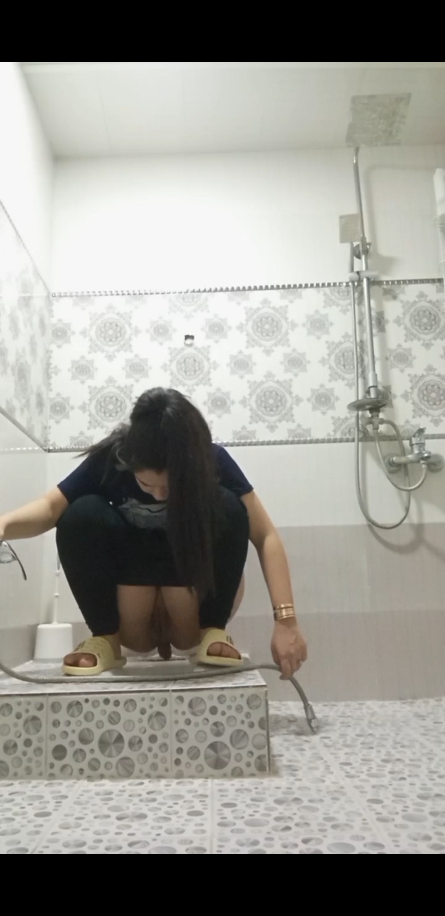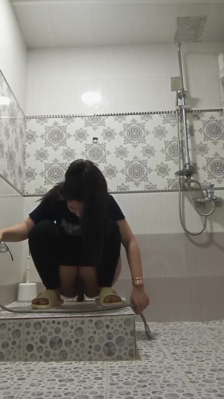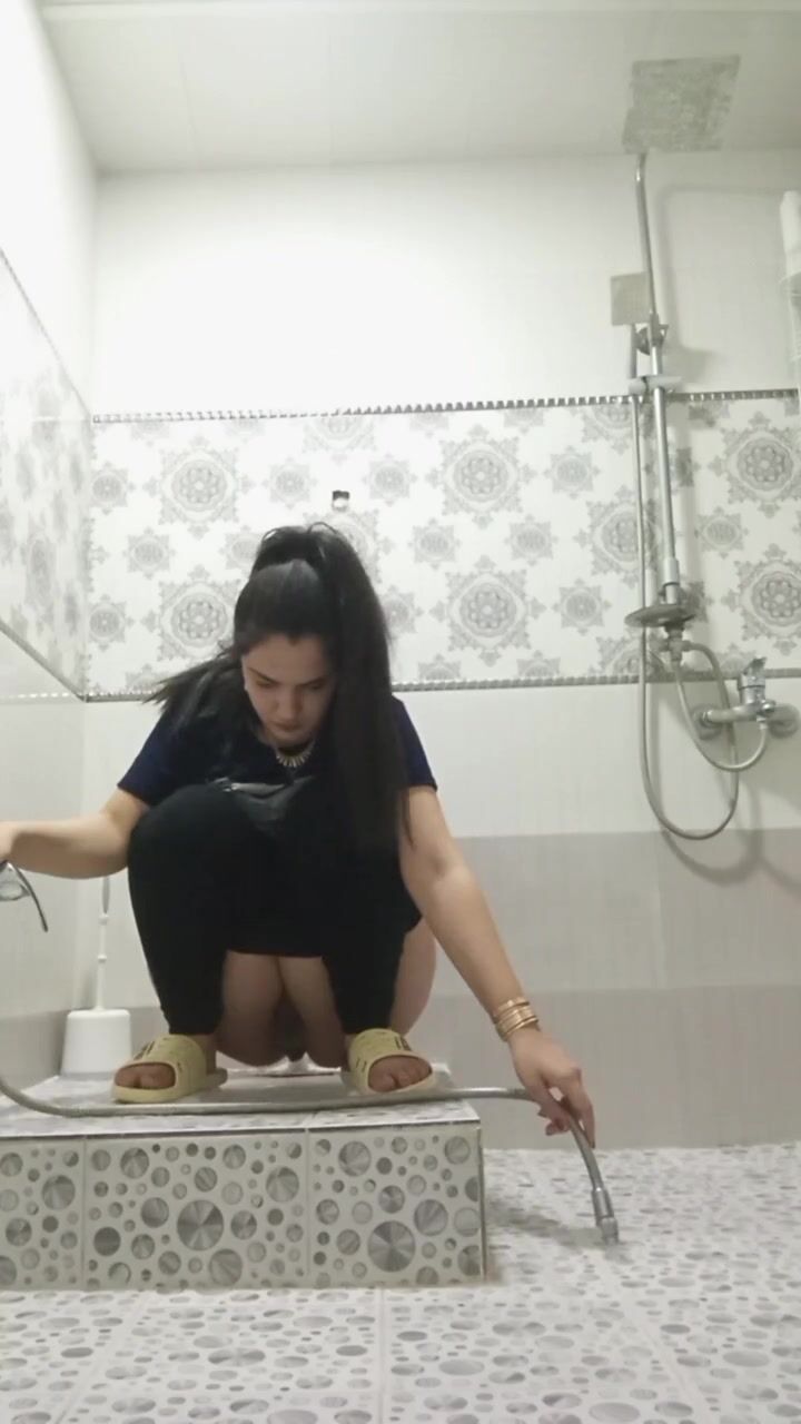 Girl open wide legs and shitting on the toilet floor