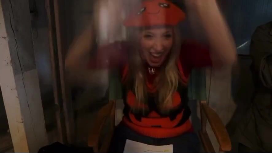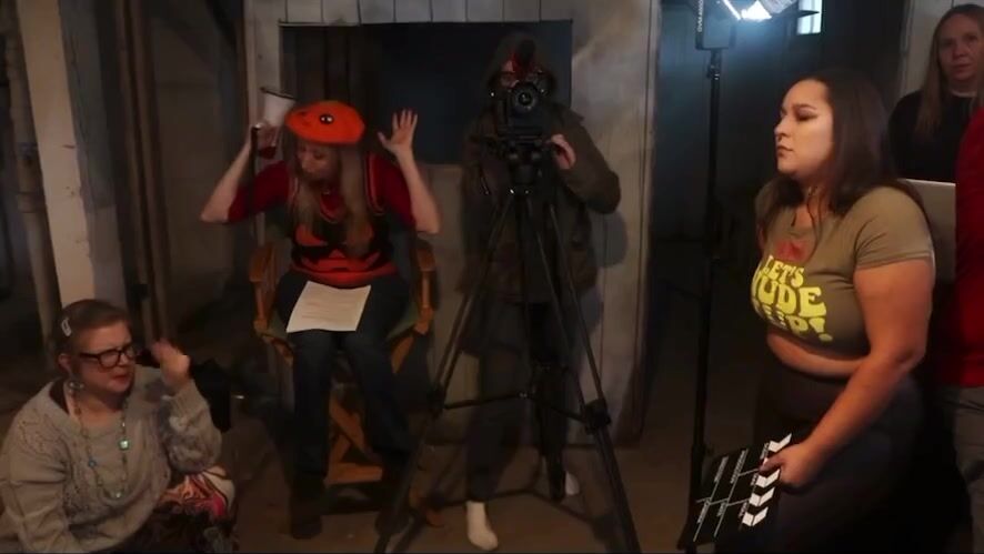 A women poops in a prop toilet during her audition