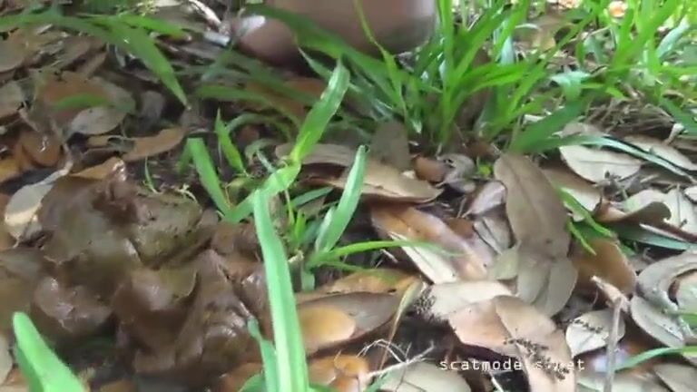 Girl pushing hard turd in forest