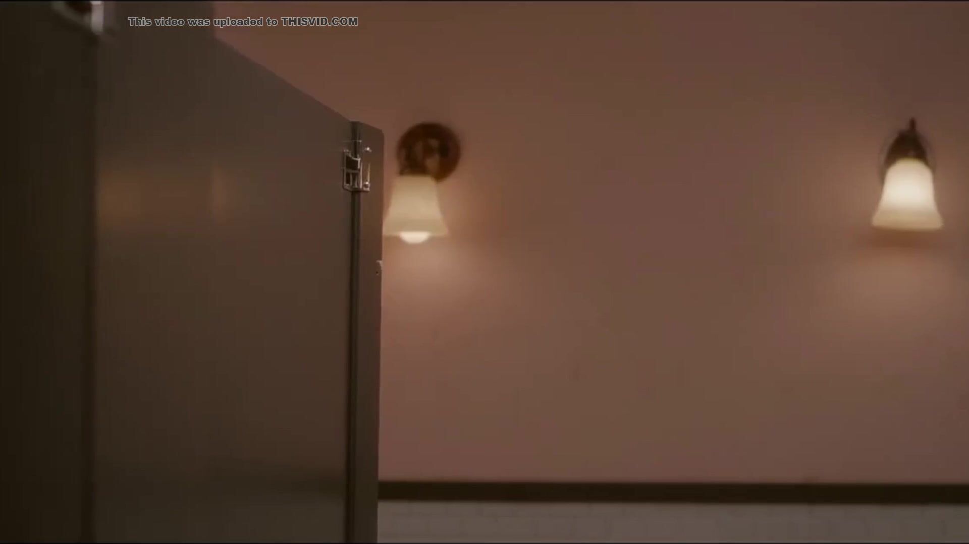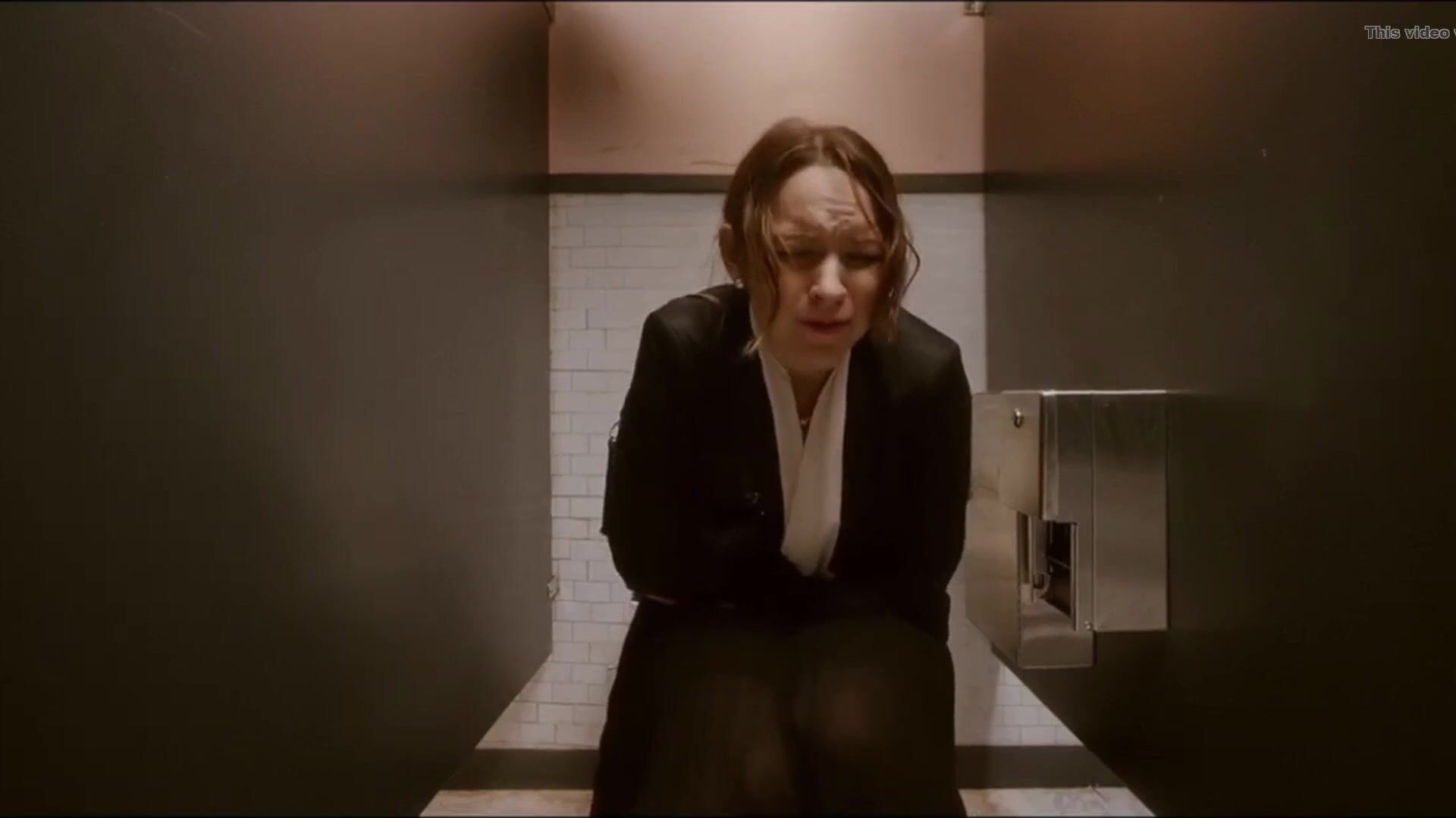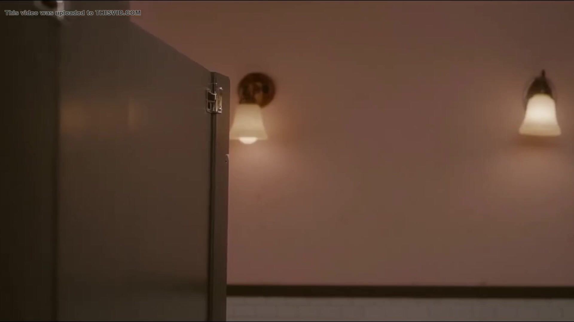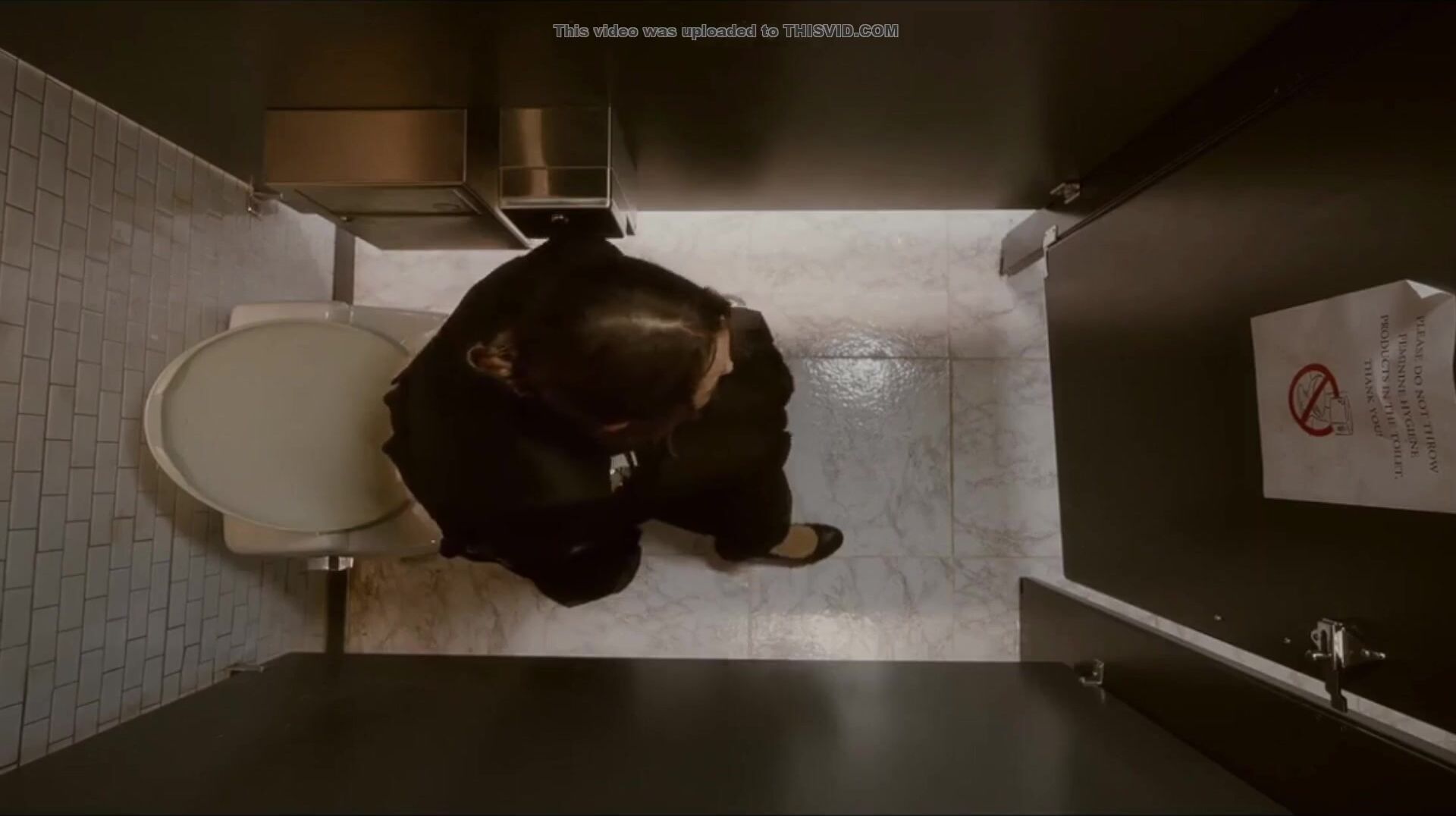 Woman has diarrhea in stall with broken door scene
