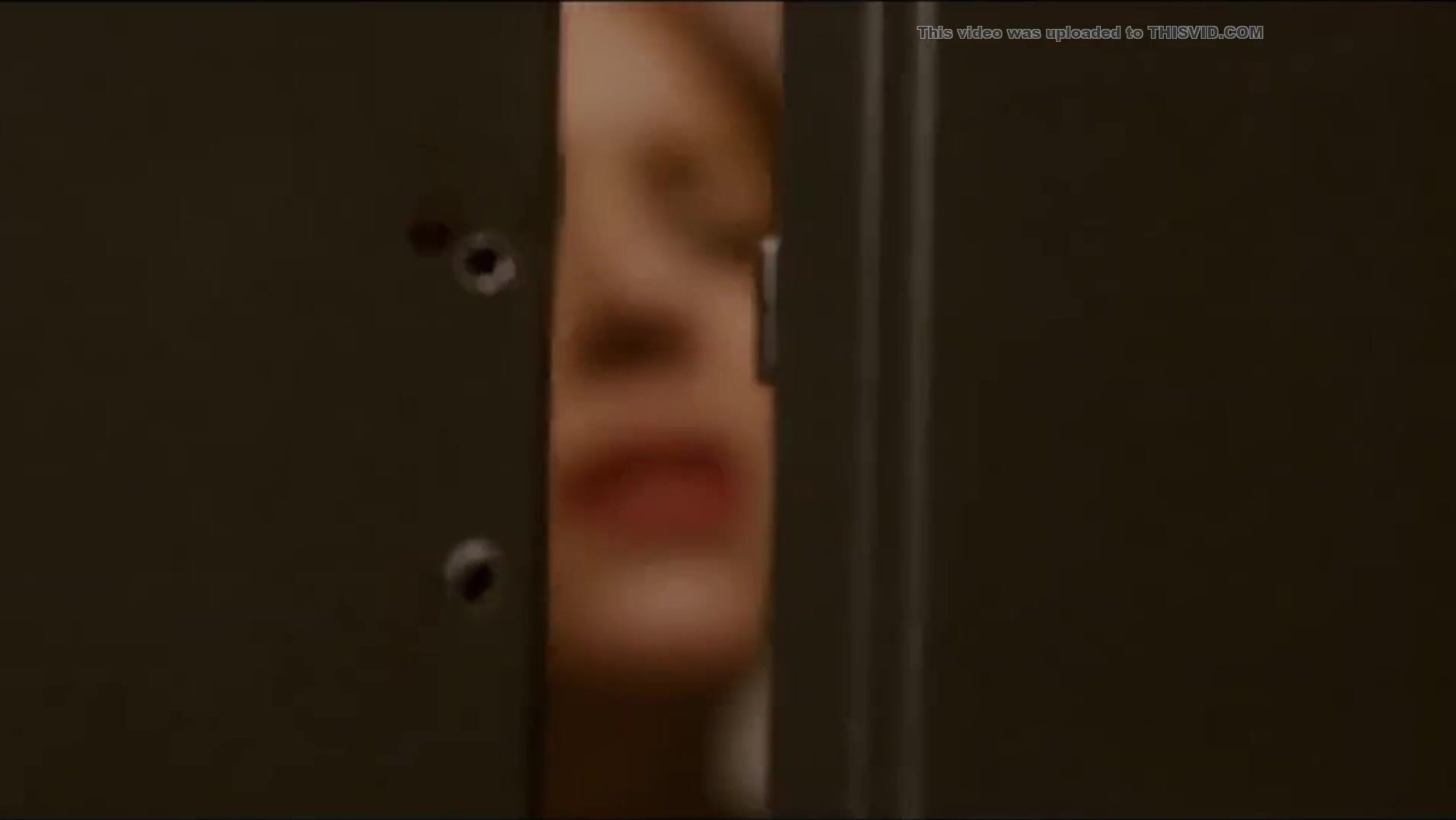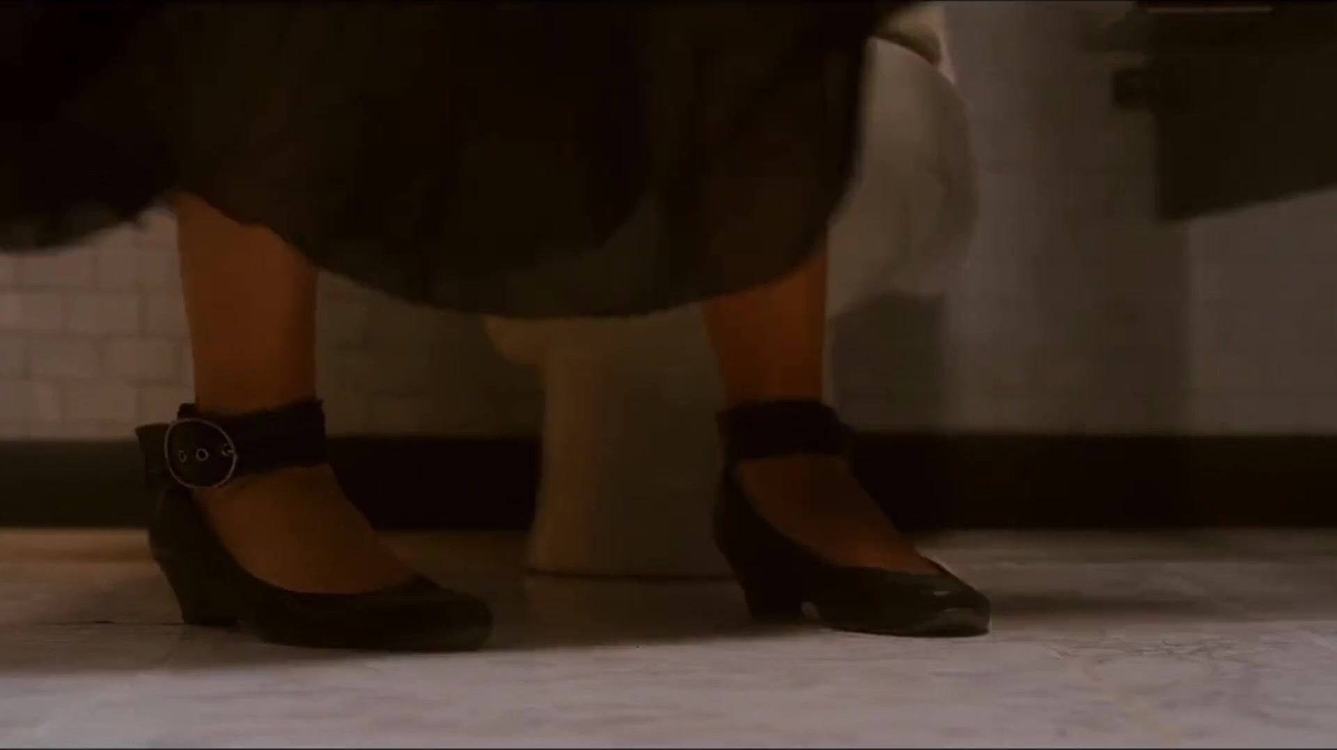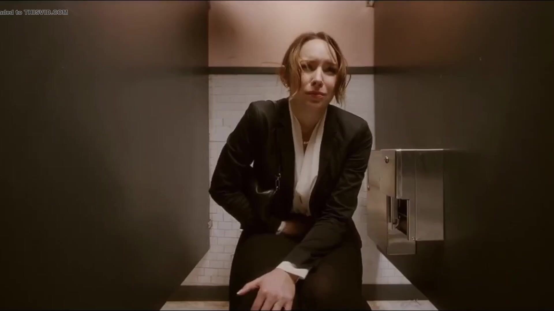 Woman has diarrhea in stall with broken door scene