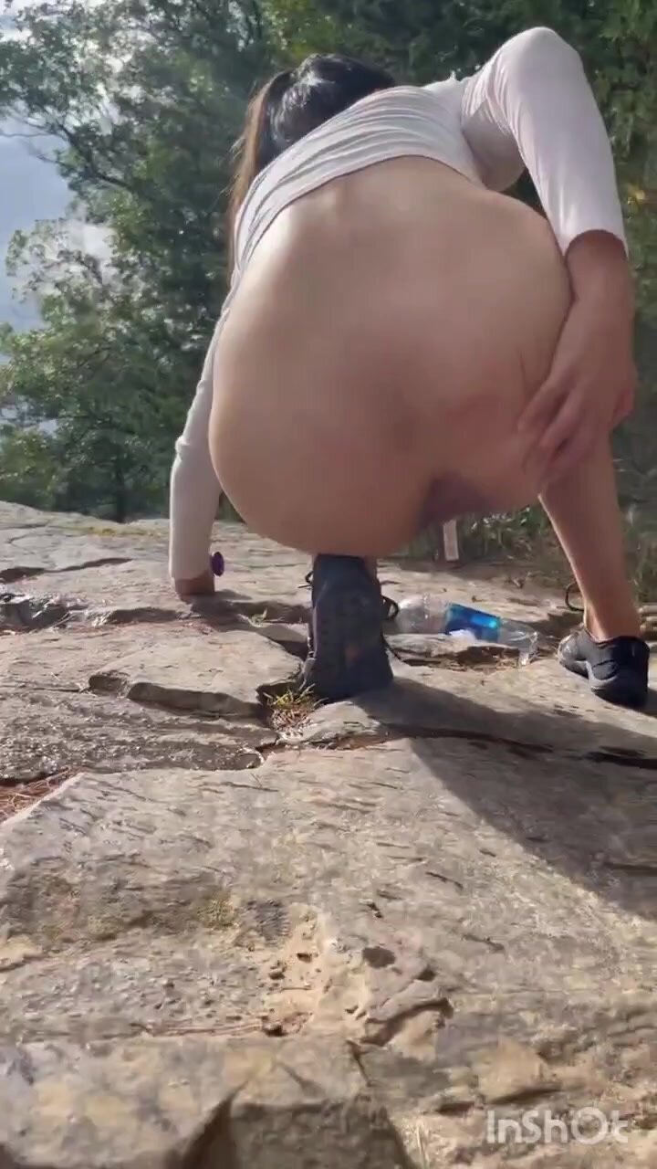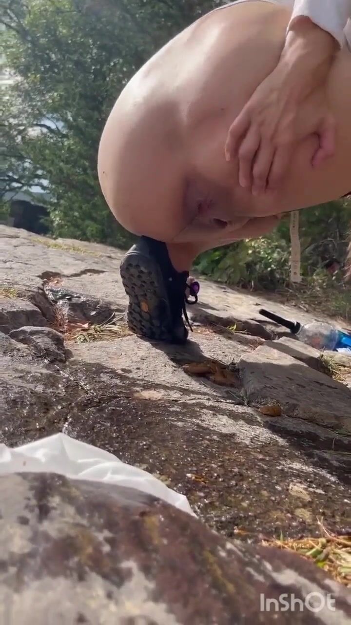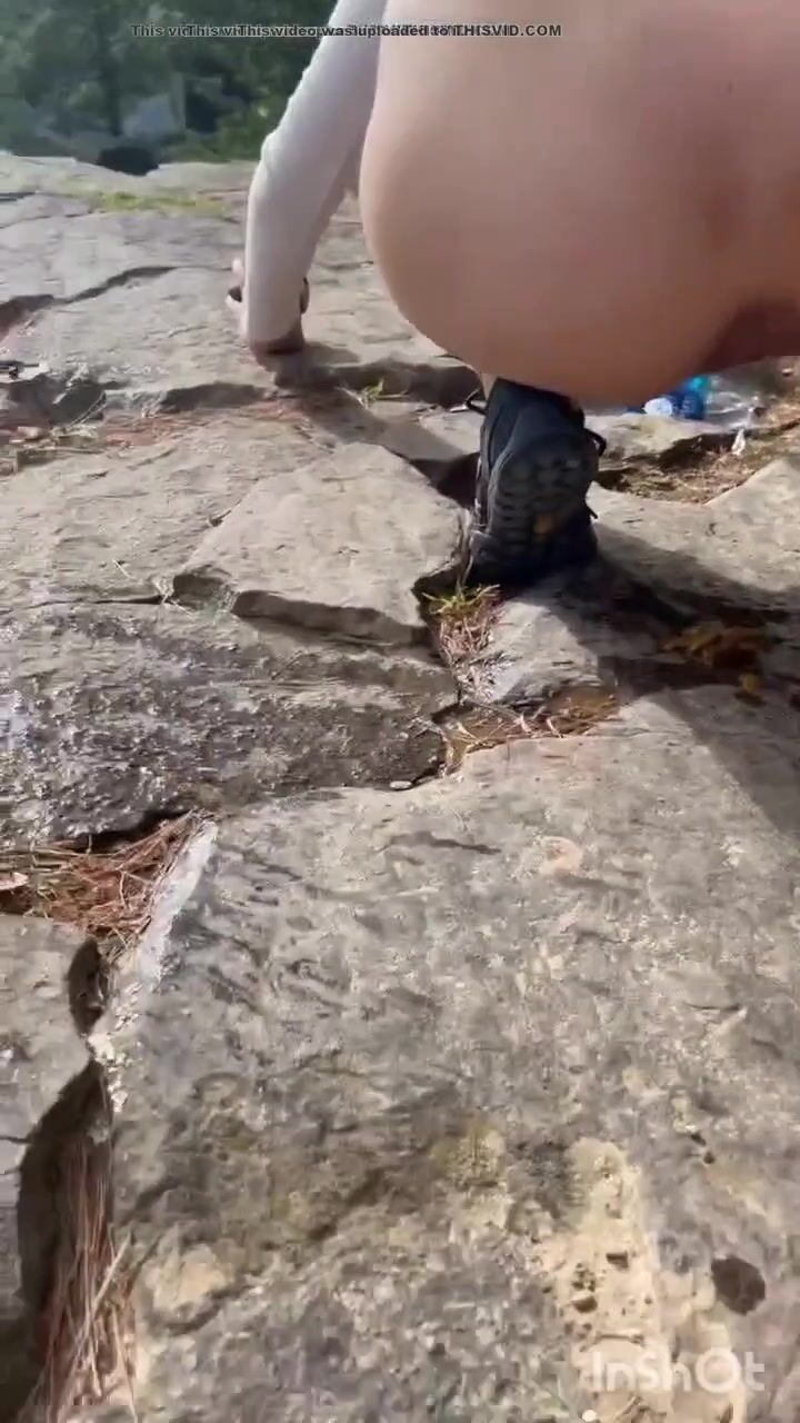 Cute girl outdoor shitting on the rocks