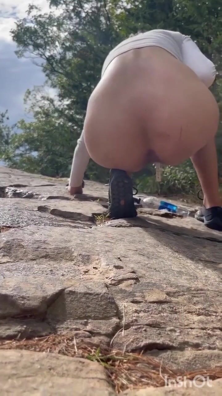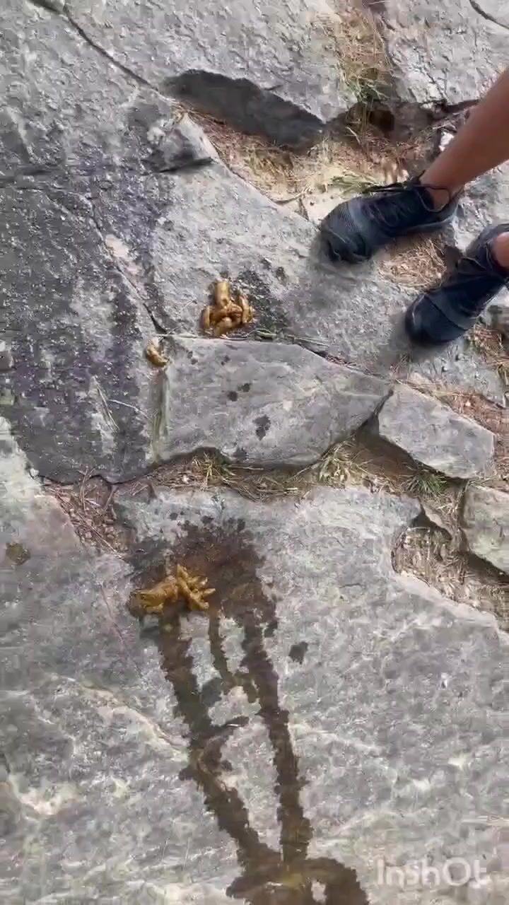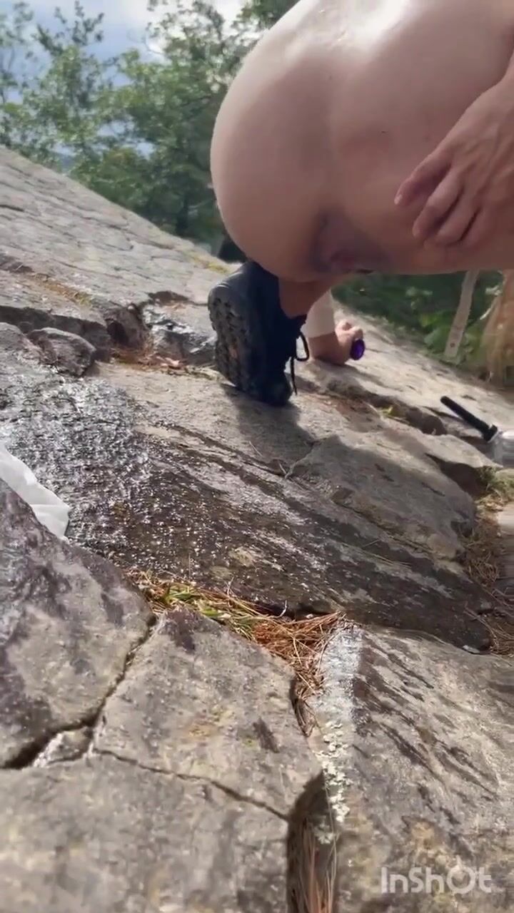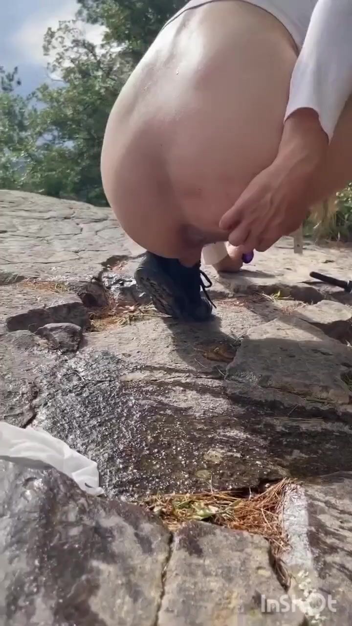 Cute girl outdoor shitting on the rocks