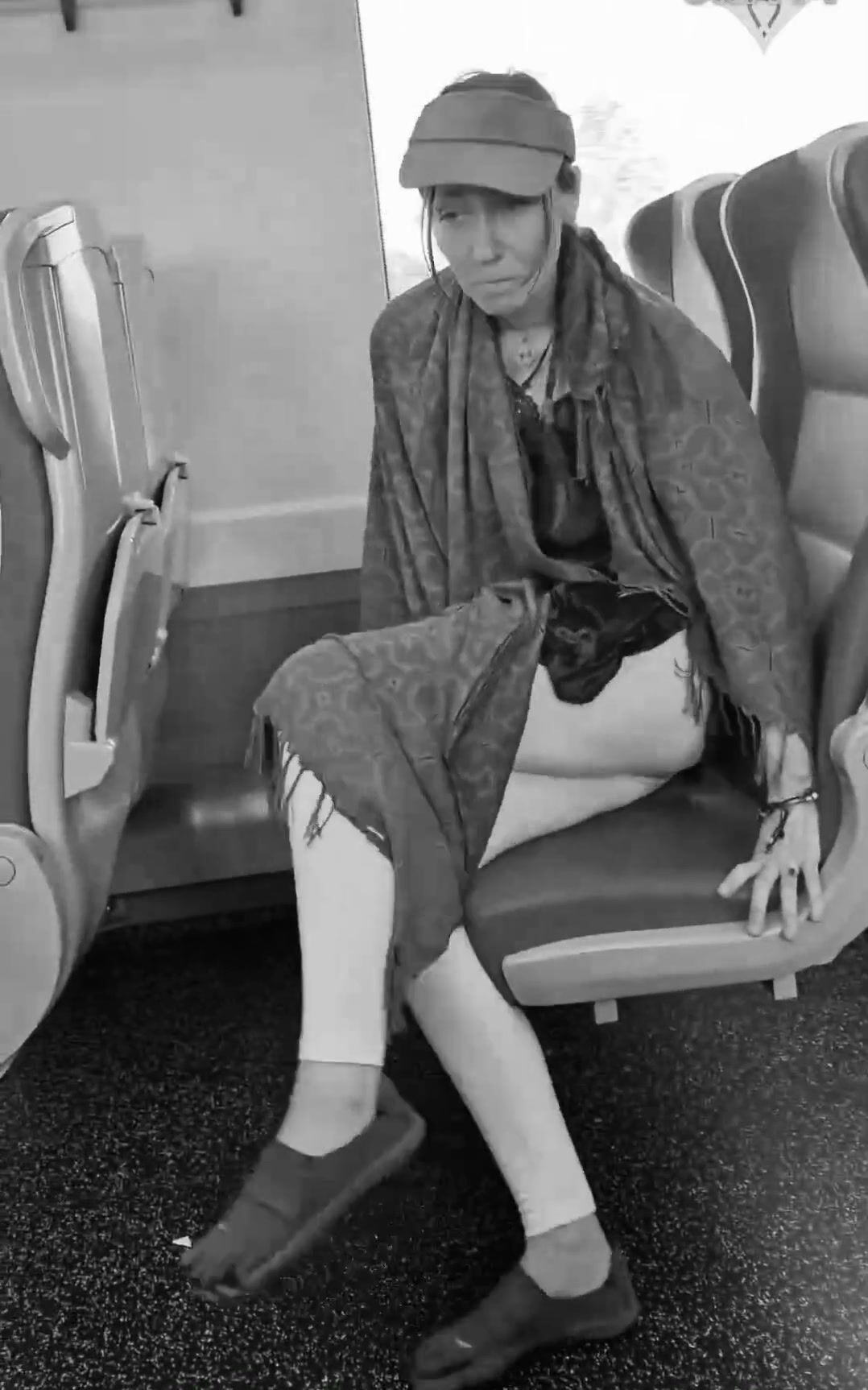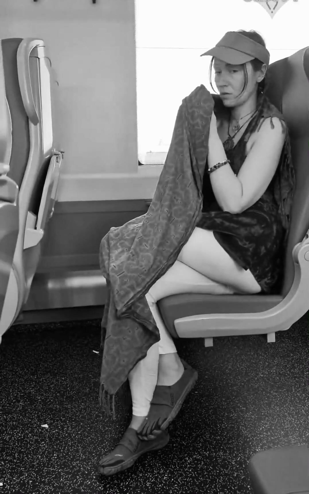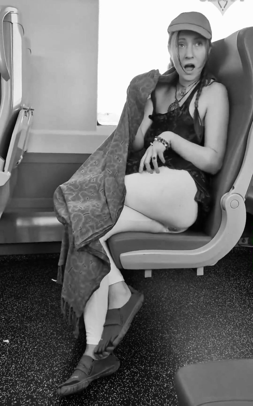 girl messes leggings on bus