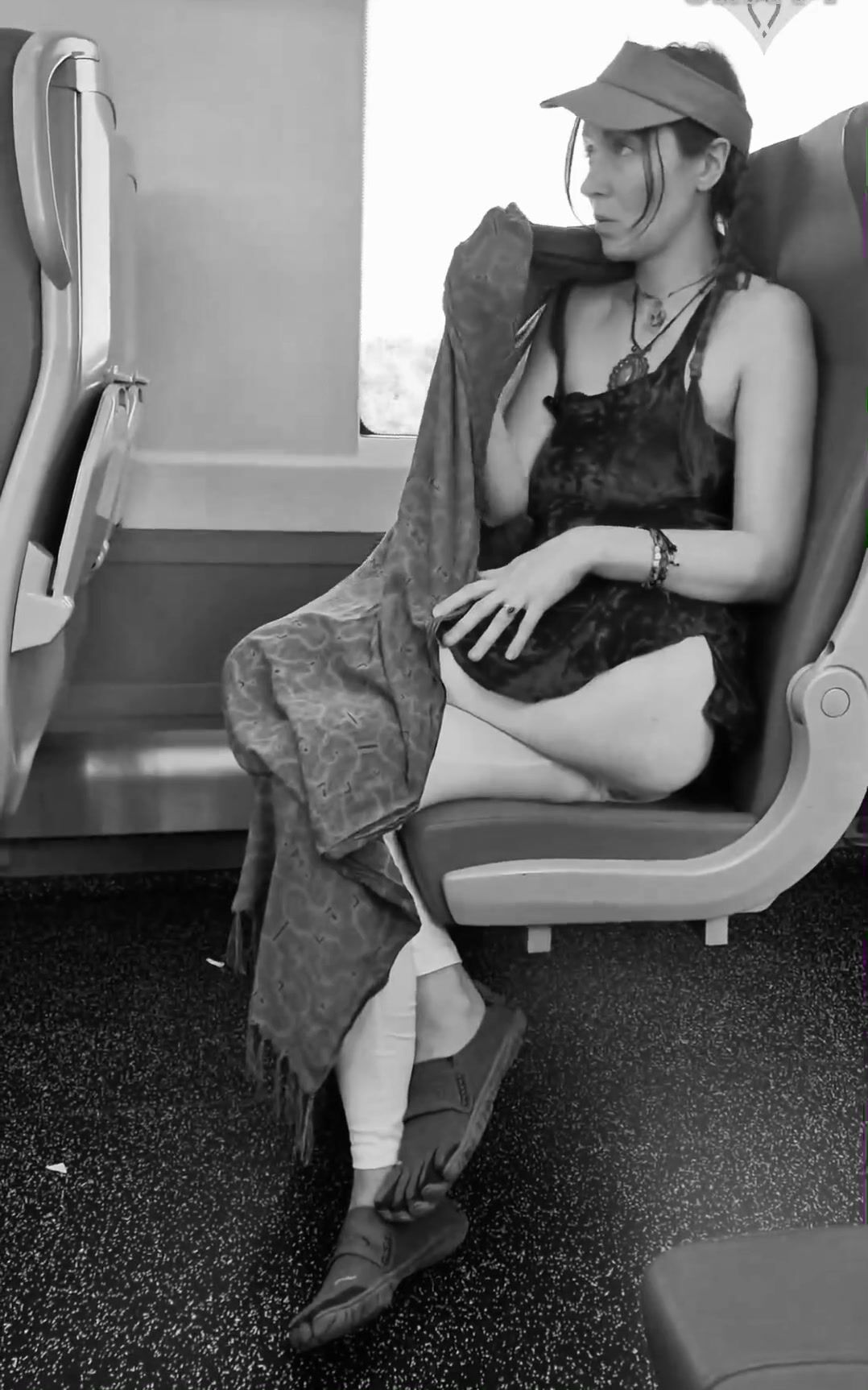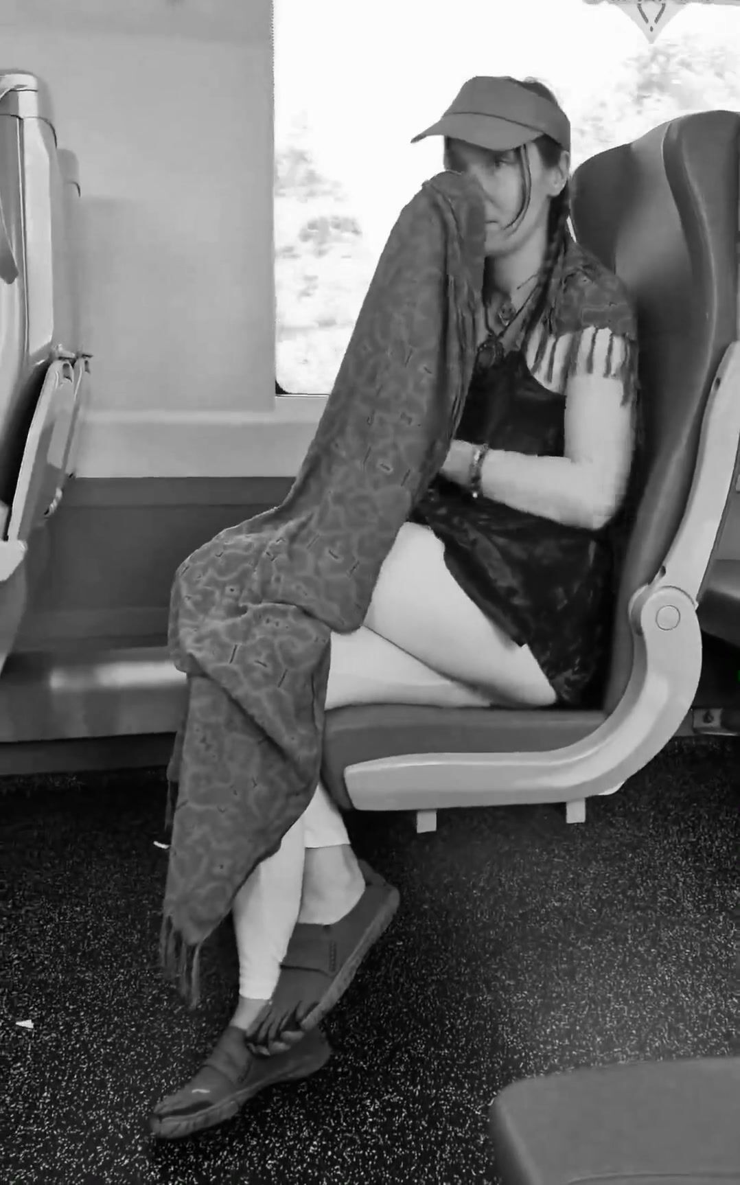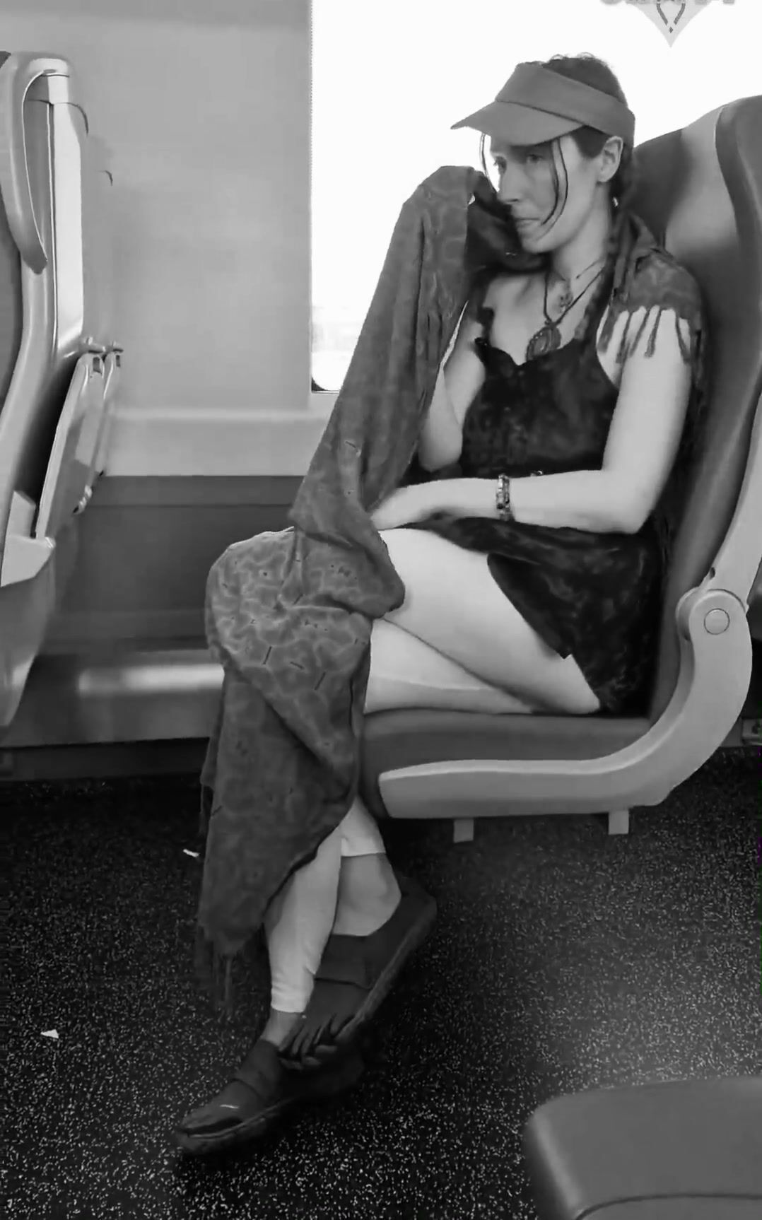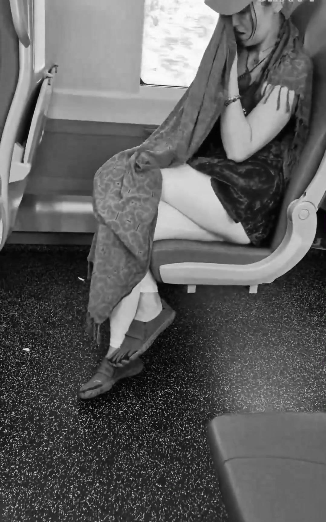 girl messes leggings on bus