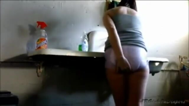 Diaper girl can't hol her poop while washing the dishes