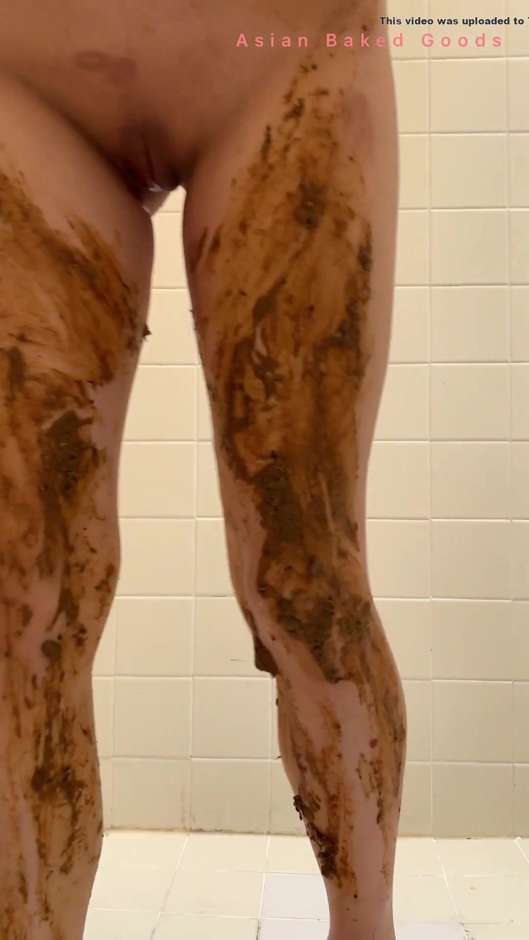 Slim girl shits in hand and smears in shower