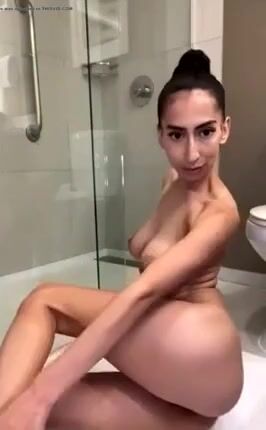 Slim brunette poops a big turd