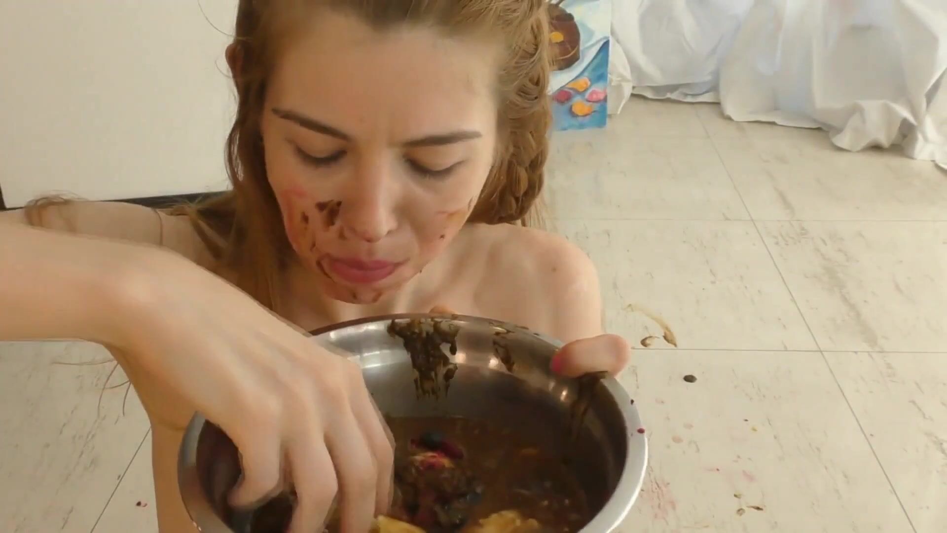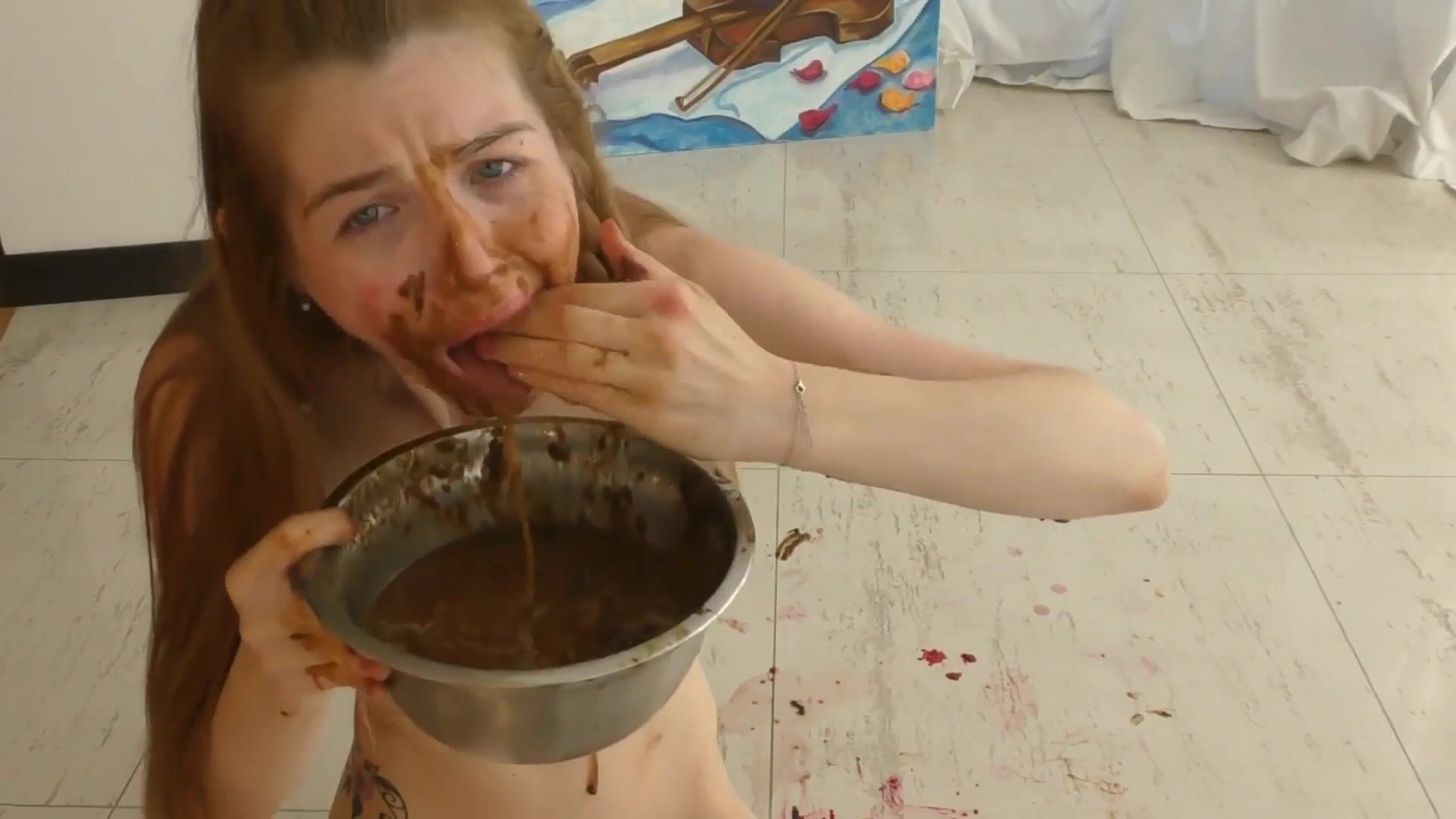 Russian slut eats shit with red fruits and banana