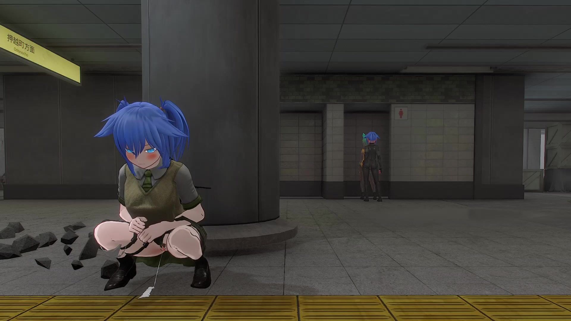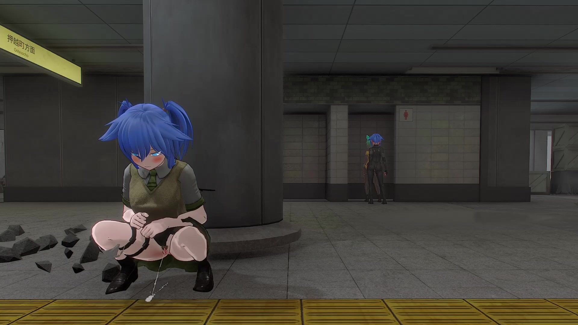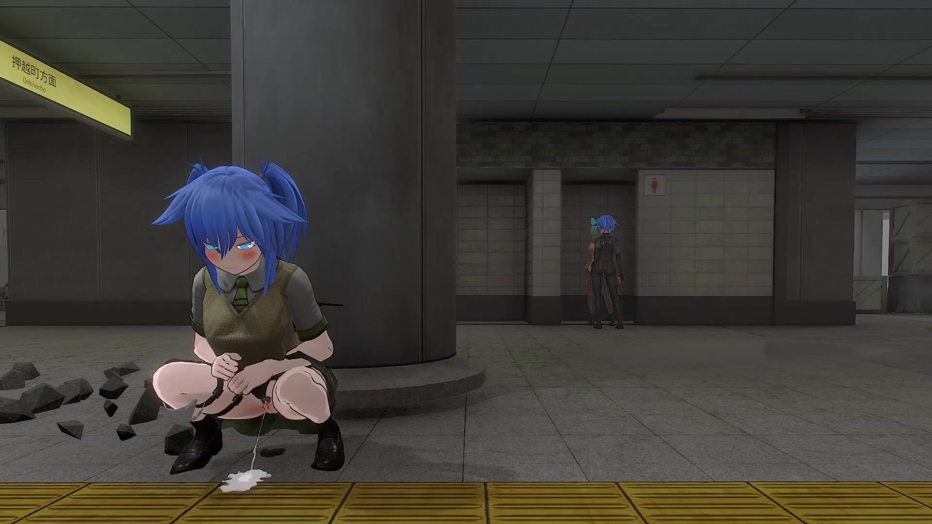 Girl peeing and pooping behind pillar