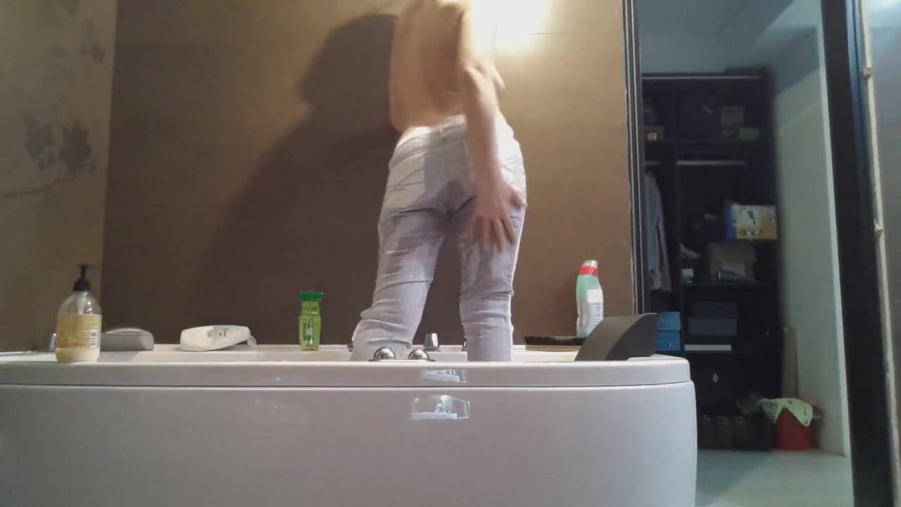 Pooping in White Denim before spreading buttocks