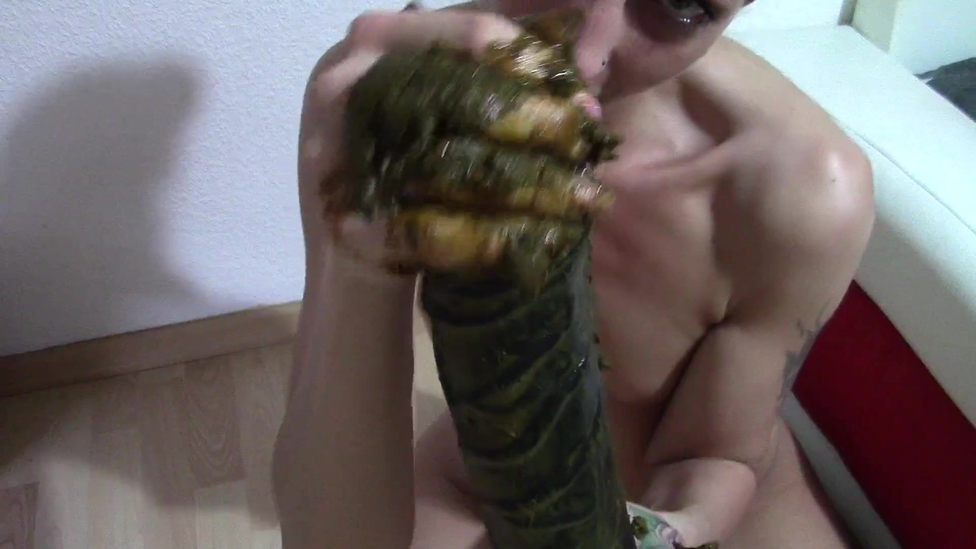 Dirty girl ride a big dildo and shit on it