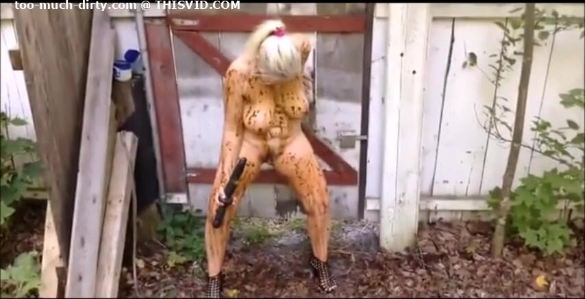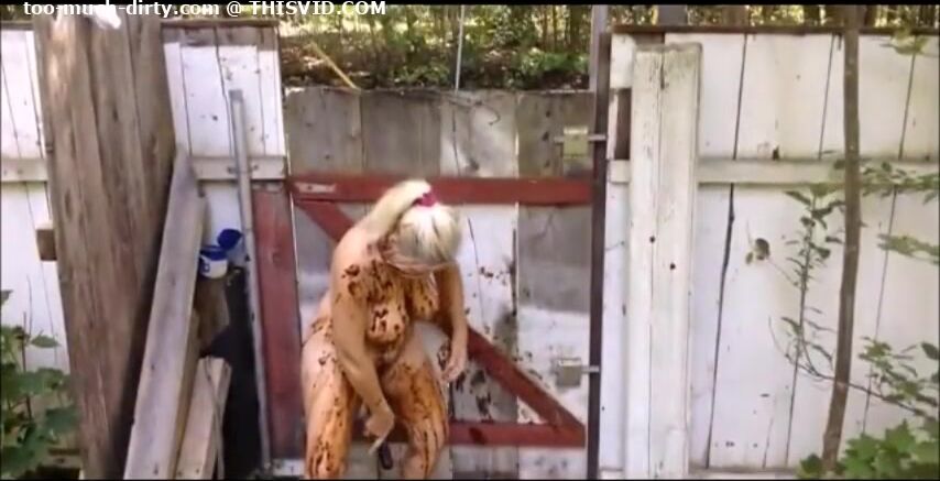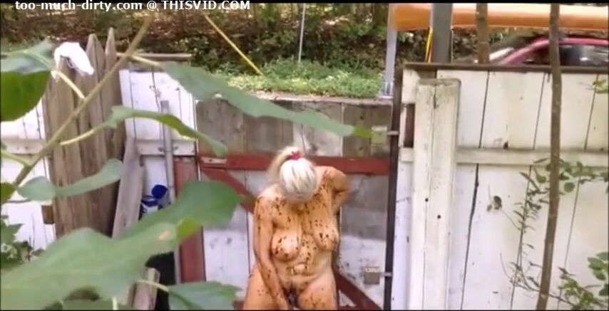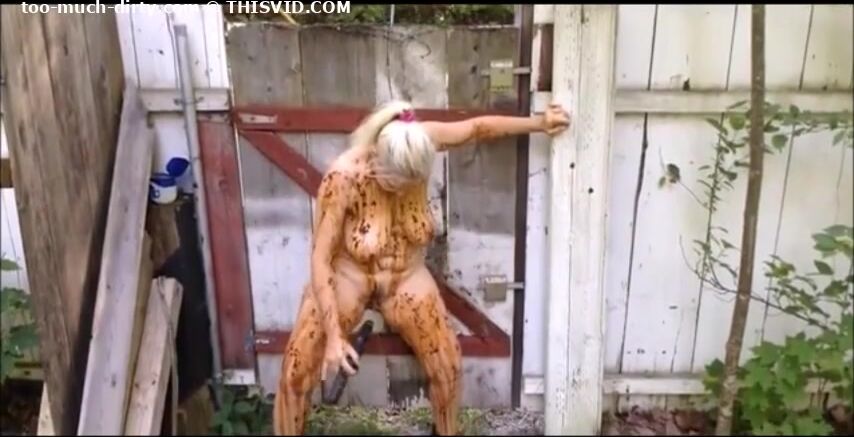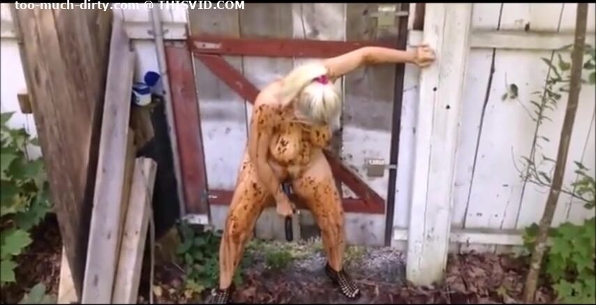 Blonde MILF shitting in the shabby courtyard