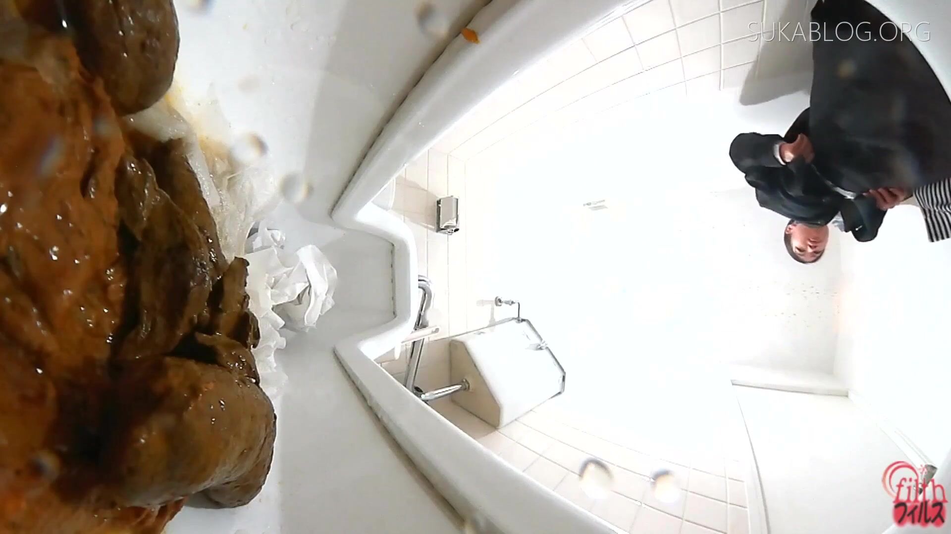 Japanese shitting on toilet.