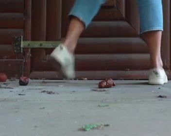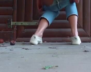 Junge Frau kackt vor Gartenhaus